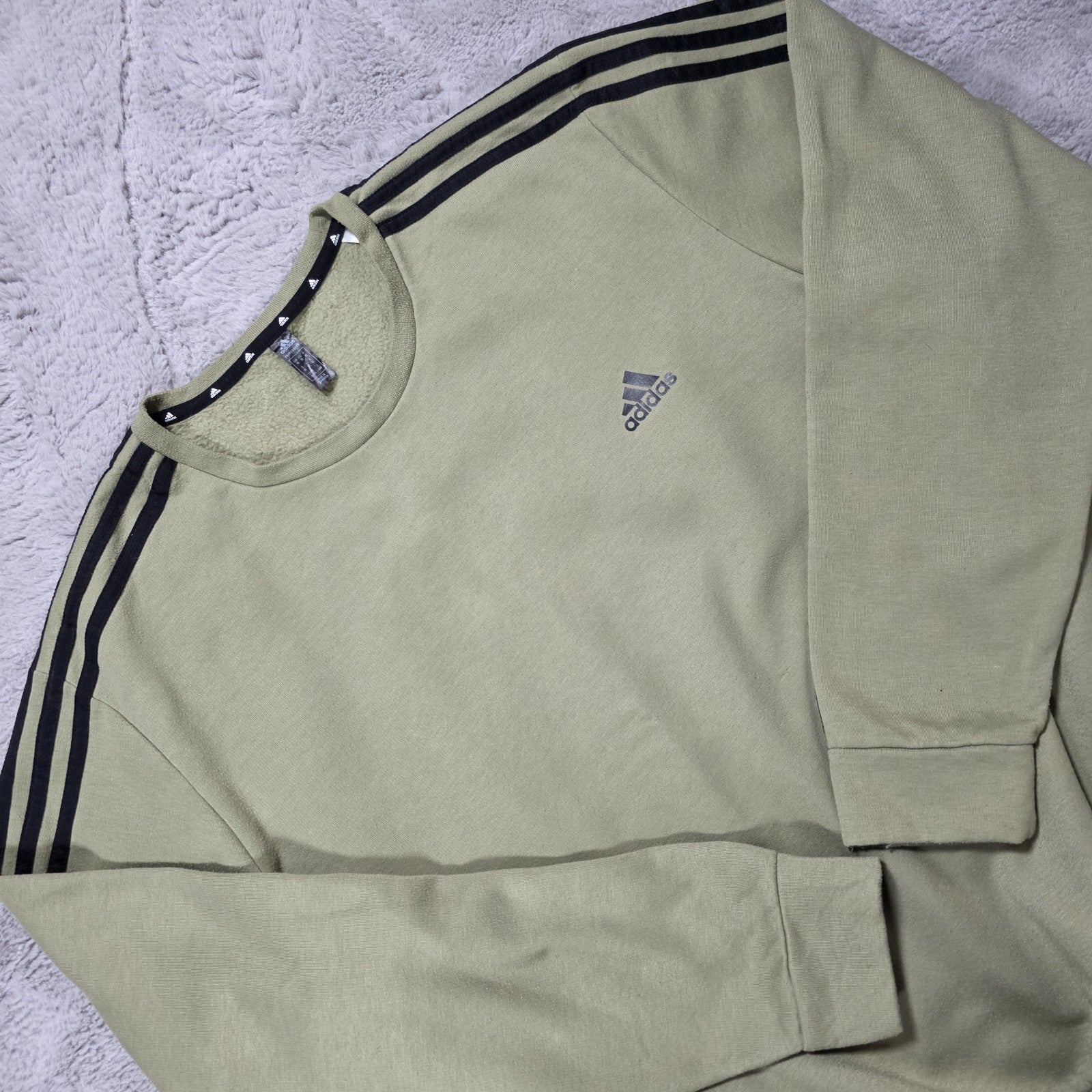 π’ Soft and sustainable comfort from Adidasβ Primegreen range. This khaki green sweatshirt features the signature 3-stripe design across the shoulders and a minimalist embroidered Adidas logo on the chest.
