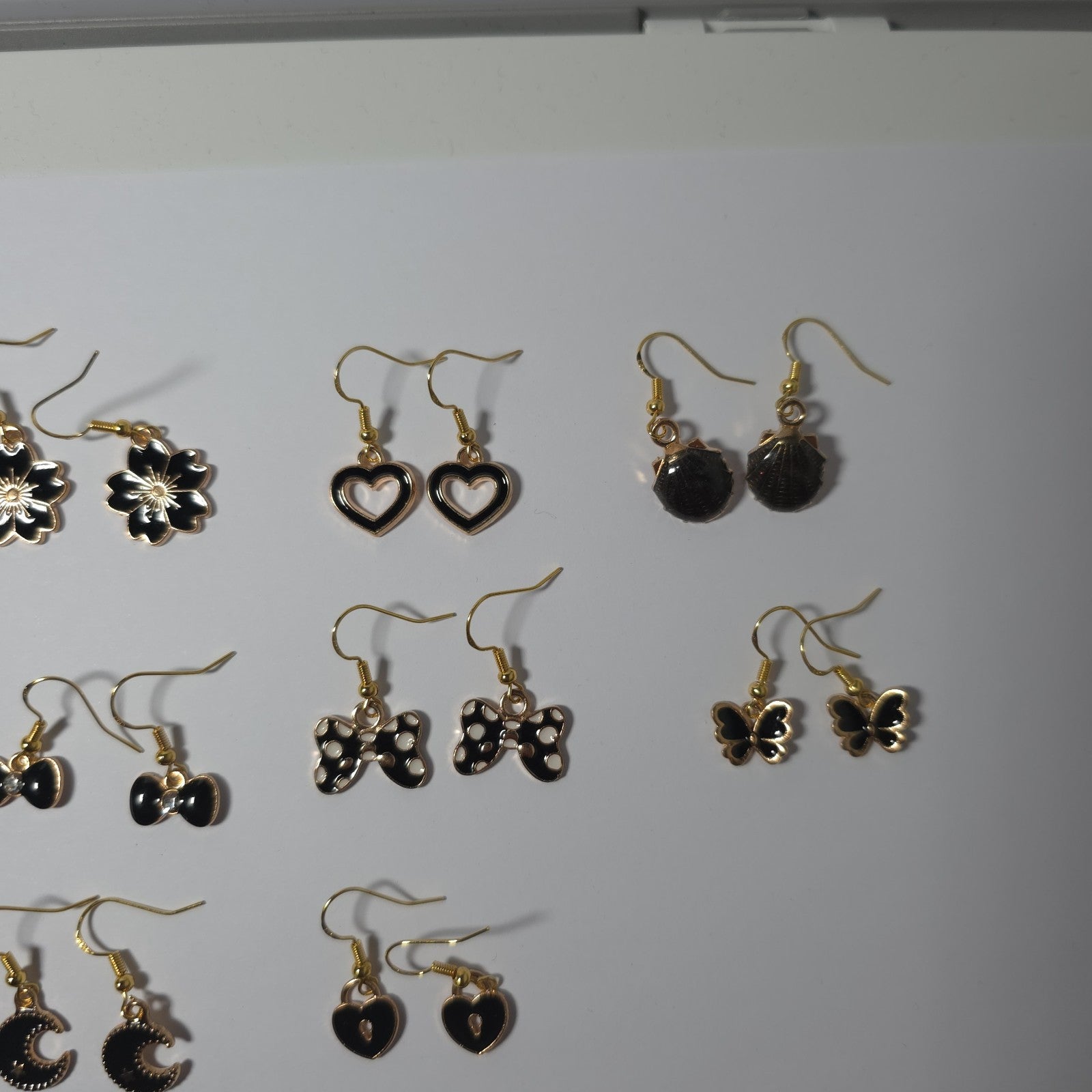 A beautiful assortment of charm earrings, featuring 10 pairs with enamel bases and gold-plated details. Each pair is designed with 925 silver hooks for comfort and durability. Perfect for adding variety to your jewellery collection or for resale as a bundle.