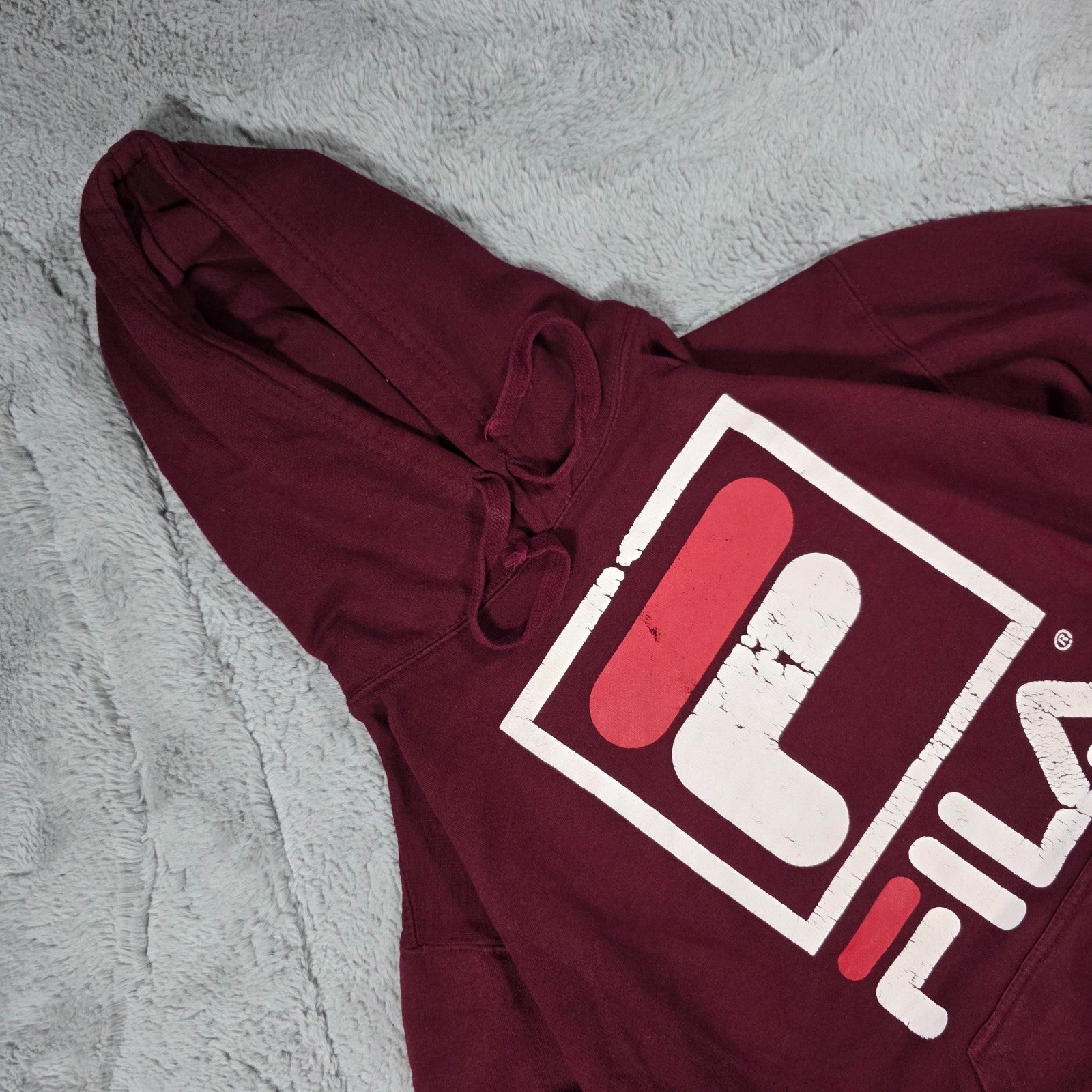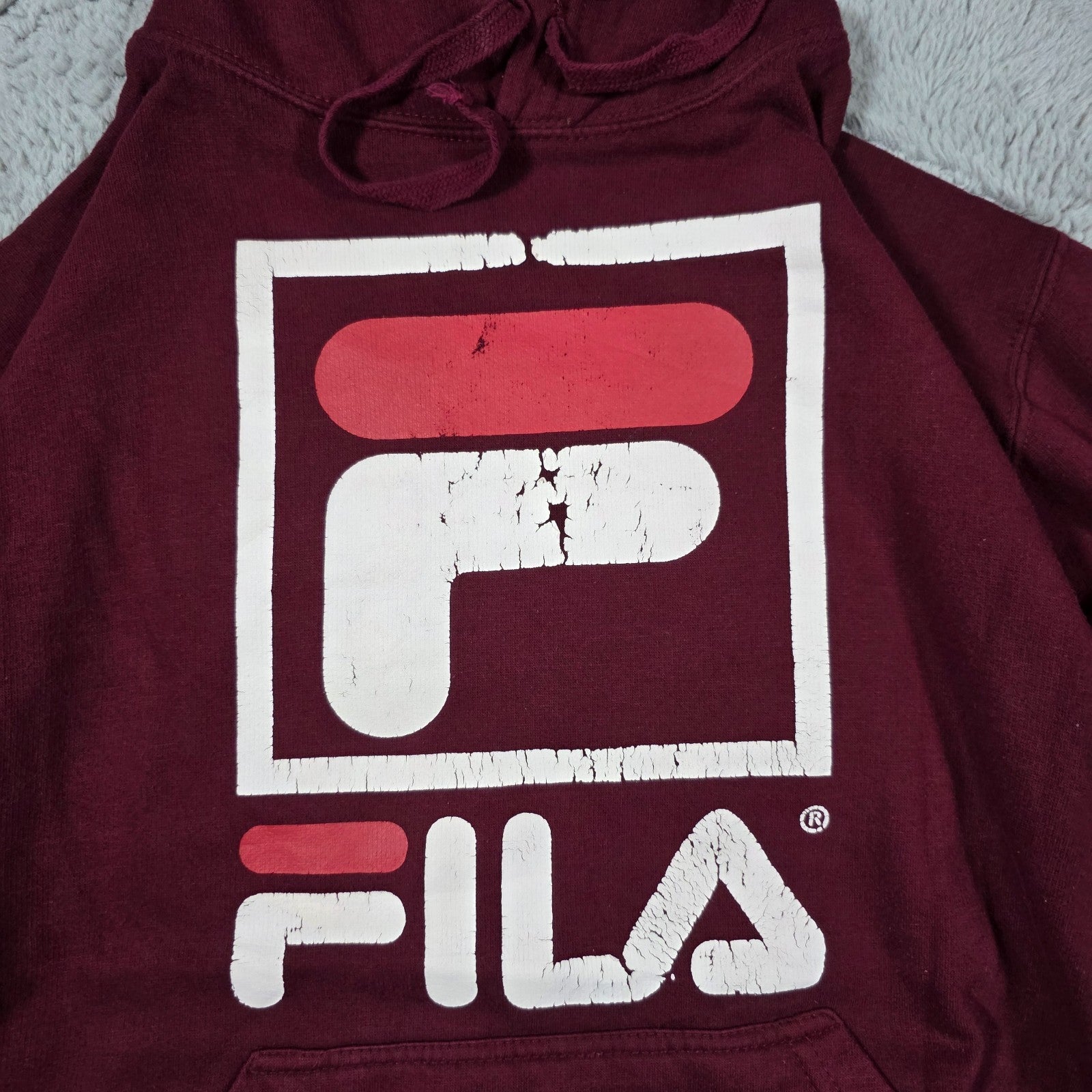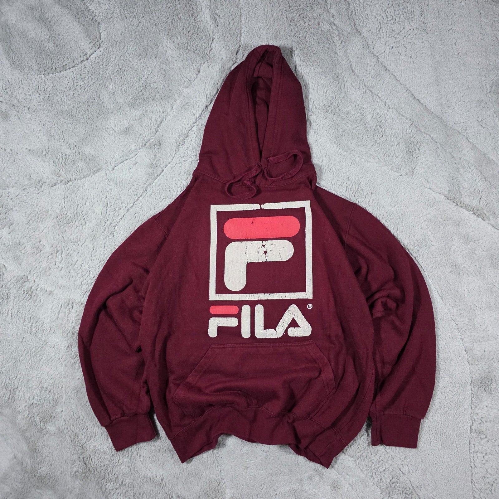 Fila Men’s Burgundy Hoodie Relaxed Fit Large Logo Pullover Cracked Print LB49