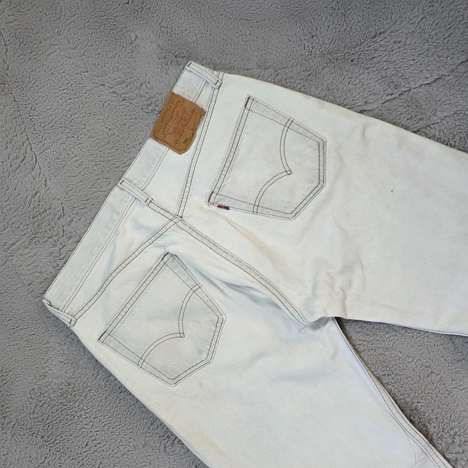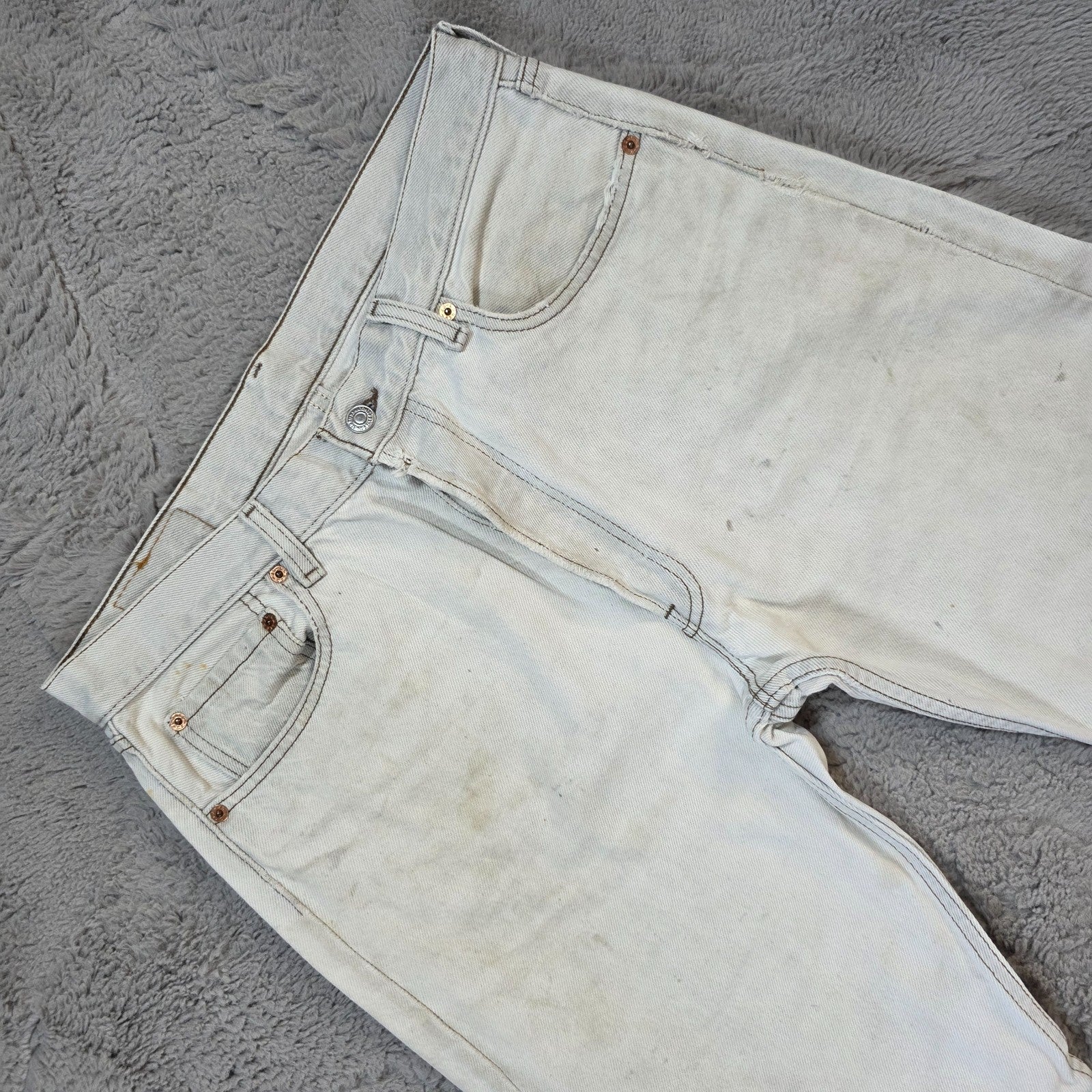 🪶 Genuine USA-made Levi’s 501s in a rare off-white/stone wash. Proper button fly, straight leg, and mid-90s/early-2000s production. These are heavily marked with stains and wear, plus knee distressing and a loose back patch — but that’s exactly why people buy them for grunge, workwear, or custom projects. 🔧