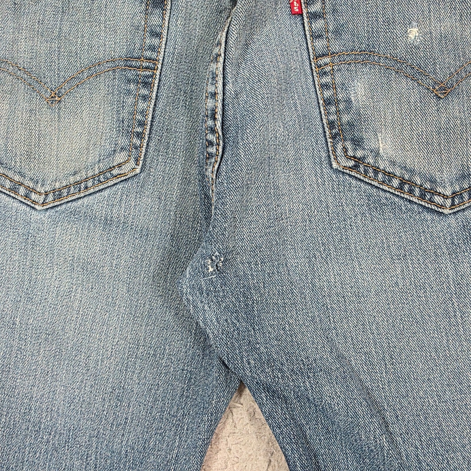 Classic Levi’s 505 men’s jeans in a blue wash with a straight leg fit. A well-worn pair with visible character, ideal for casual wear, workwear, or repair/custom use.