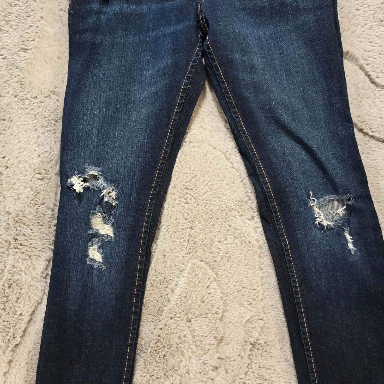 👖 Kids’ Levi’s Girlfriend jeans in a dark blue wash with heavy distressed detailing. Skinny fit with a touch of stretch, labelled size 12 REG but fits like youth/junior sizing. Please refer to the measurements below to confirm fit.