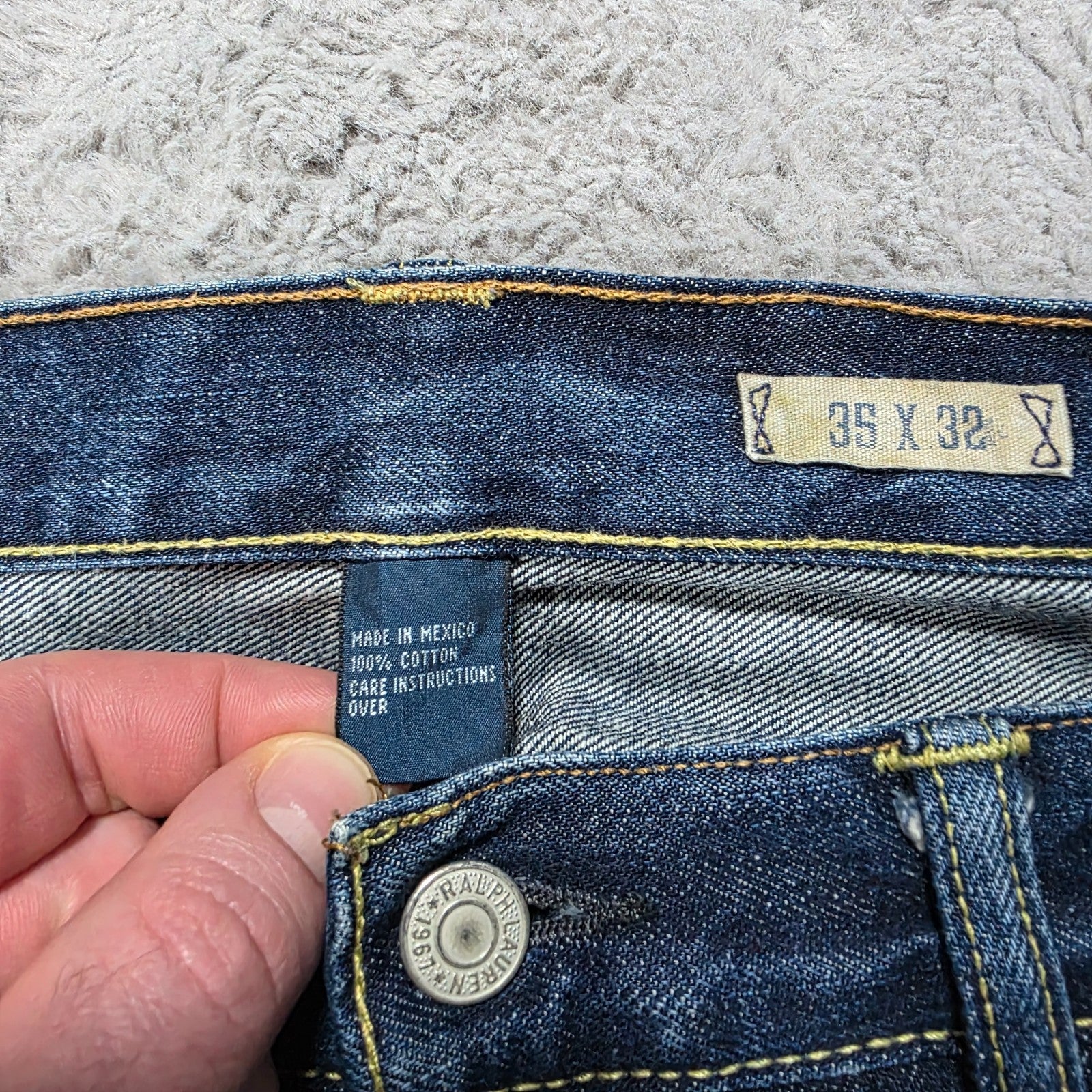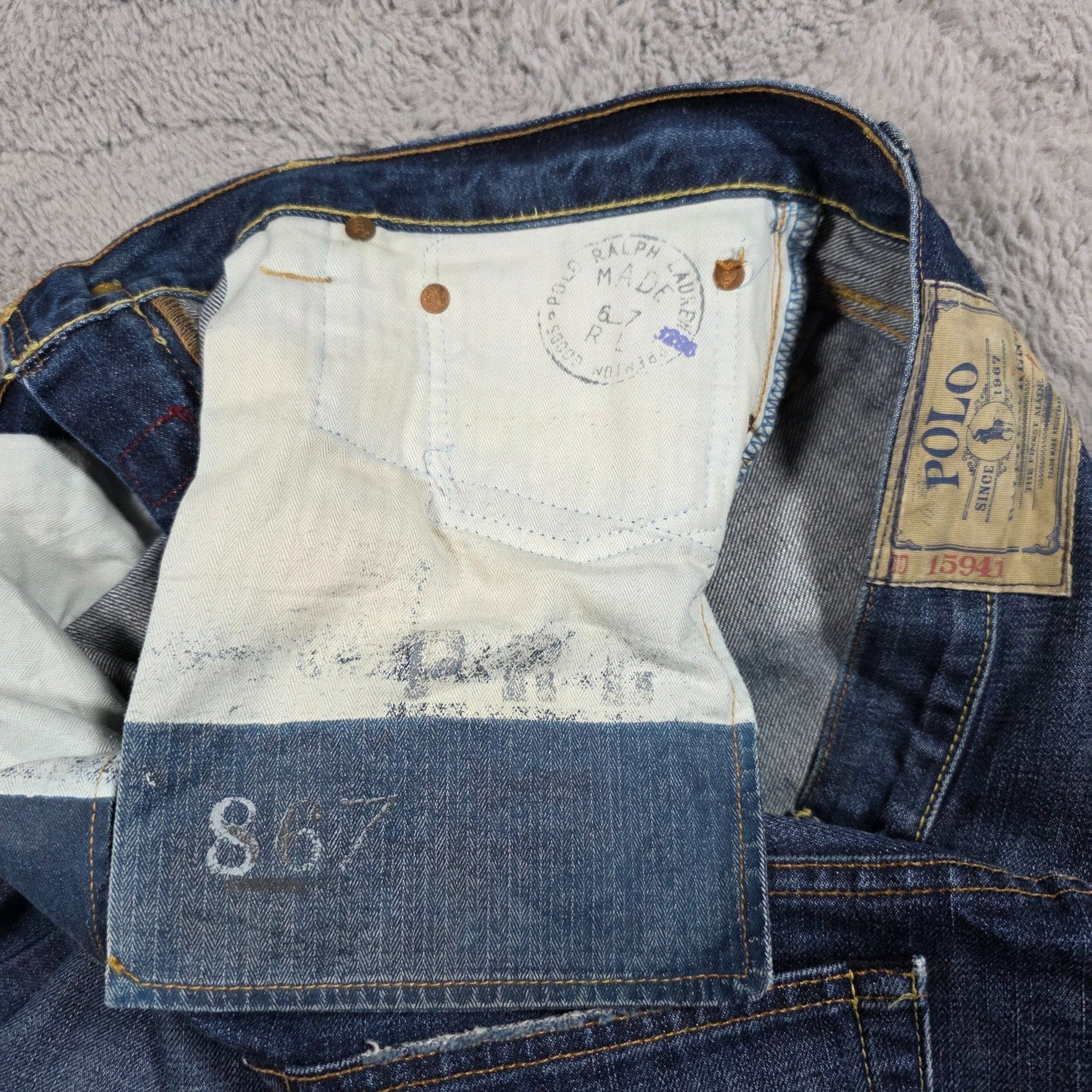 Vintage-inspired 867 Classic jeans by Polo Ralph Lauren 👖 Made in Mexico for the Australian market, featuring strengthened pocket bags and durable 100% cotton denim. Classic straight-leg fit with a medium-blue wash, whiskering, and light distressing to the back pocket — timeless workwear look with quality construction.