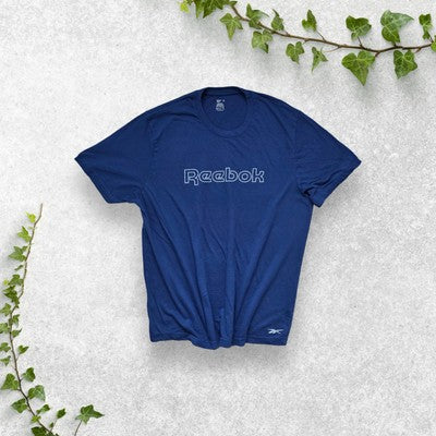 👕 Reebok Sleepwear navy blue t-shirt featuring a bold outlined logo across the chest and small Reebok logo near the hem.