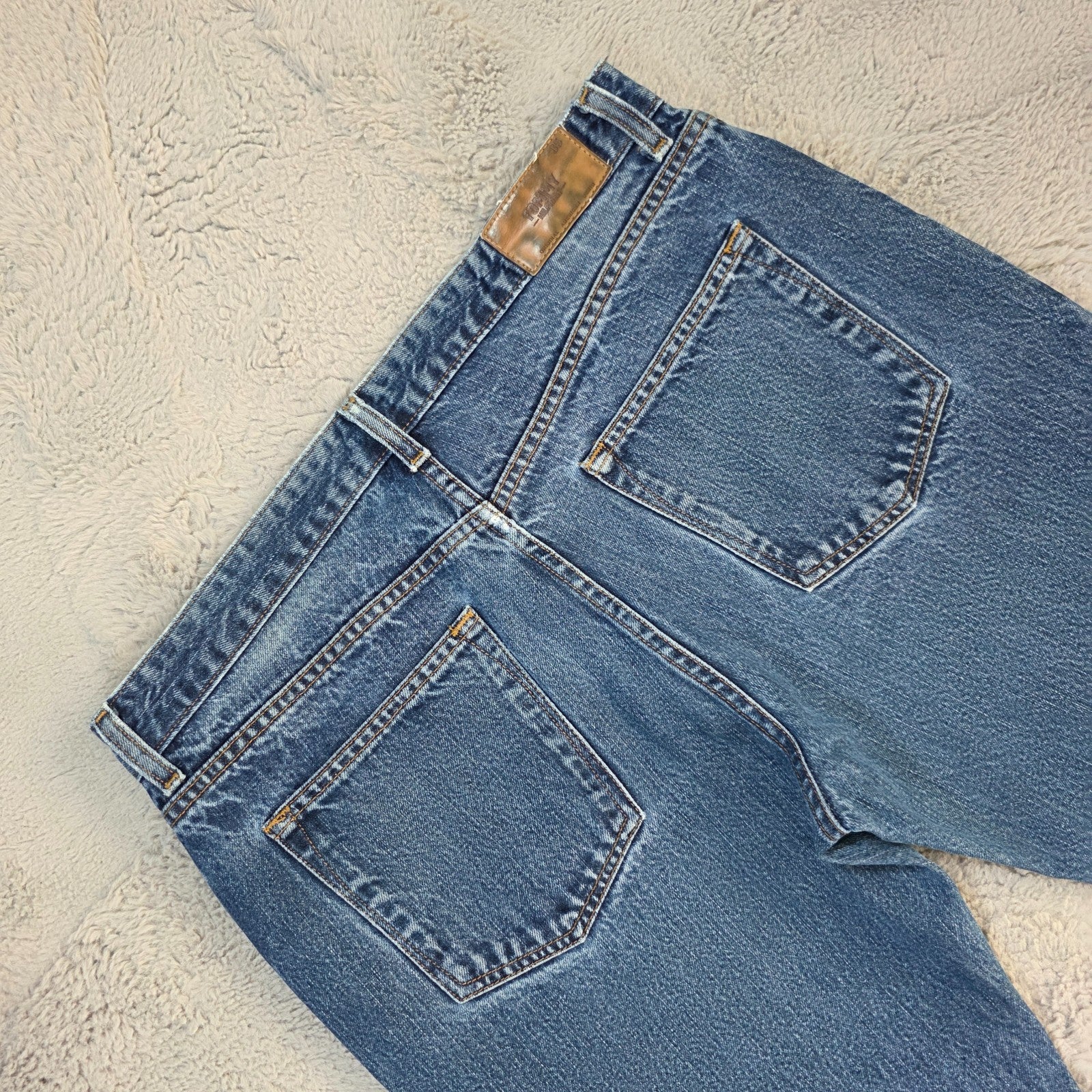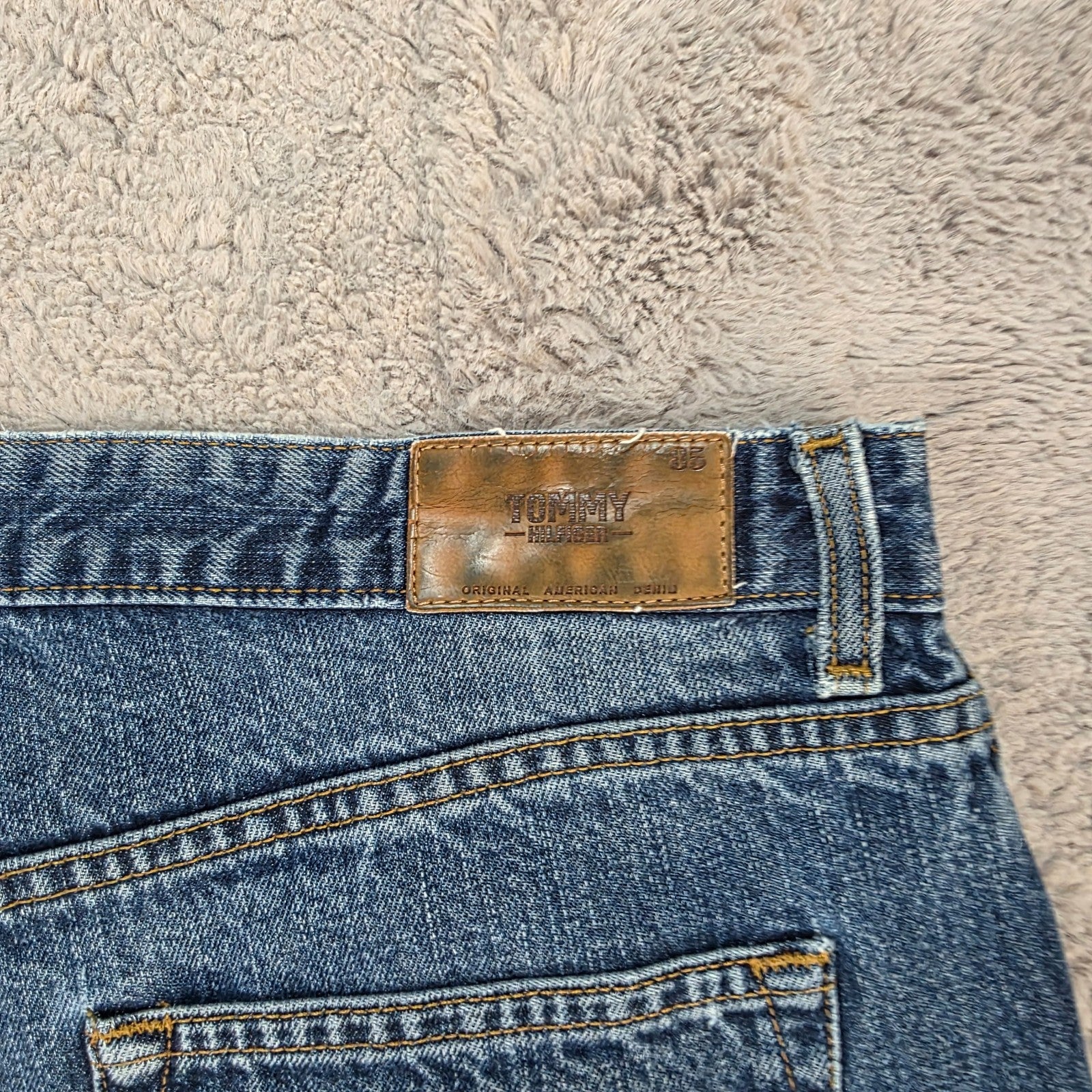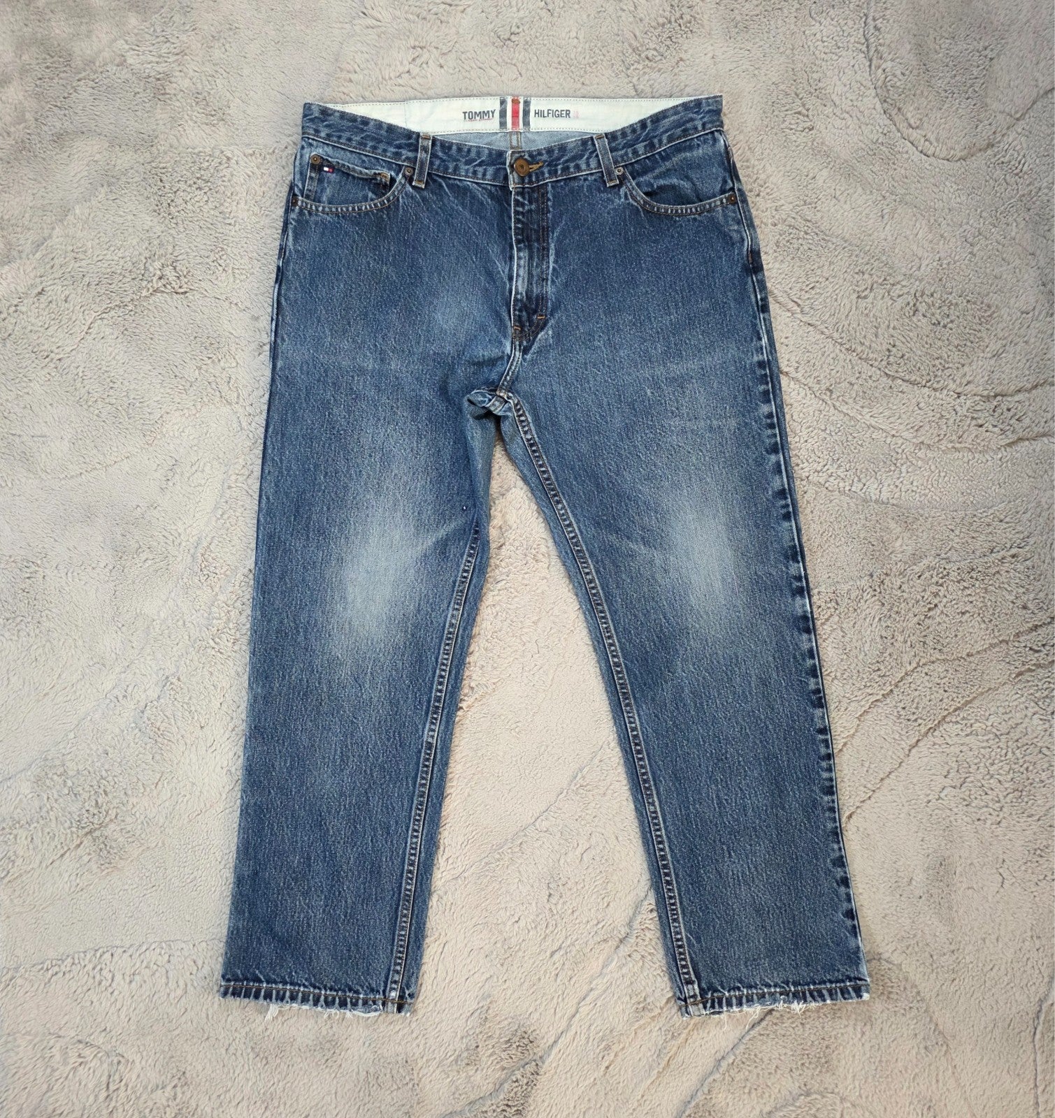 Classic Tommy Hilfiger straight leg jeans 👖 Made in Mexico from 100% cotton denim. Medium blue wash with gentle fading and authentic worn-in look. Features the signature Tommy flag logo on the coin pocket and branded leather back patch.