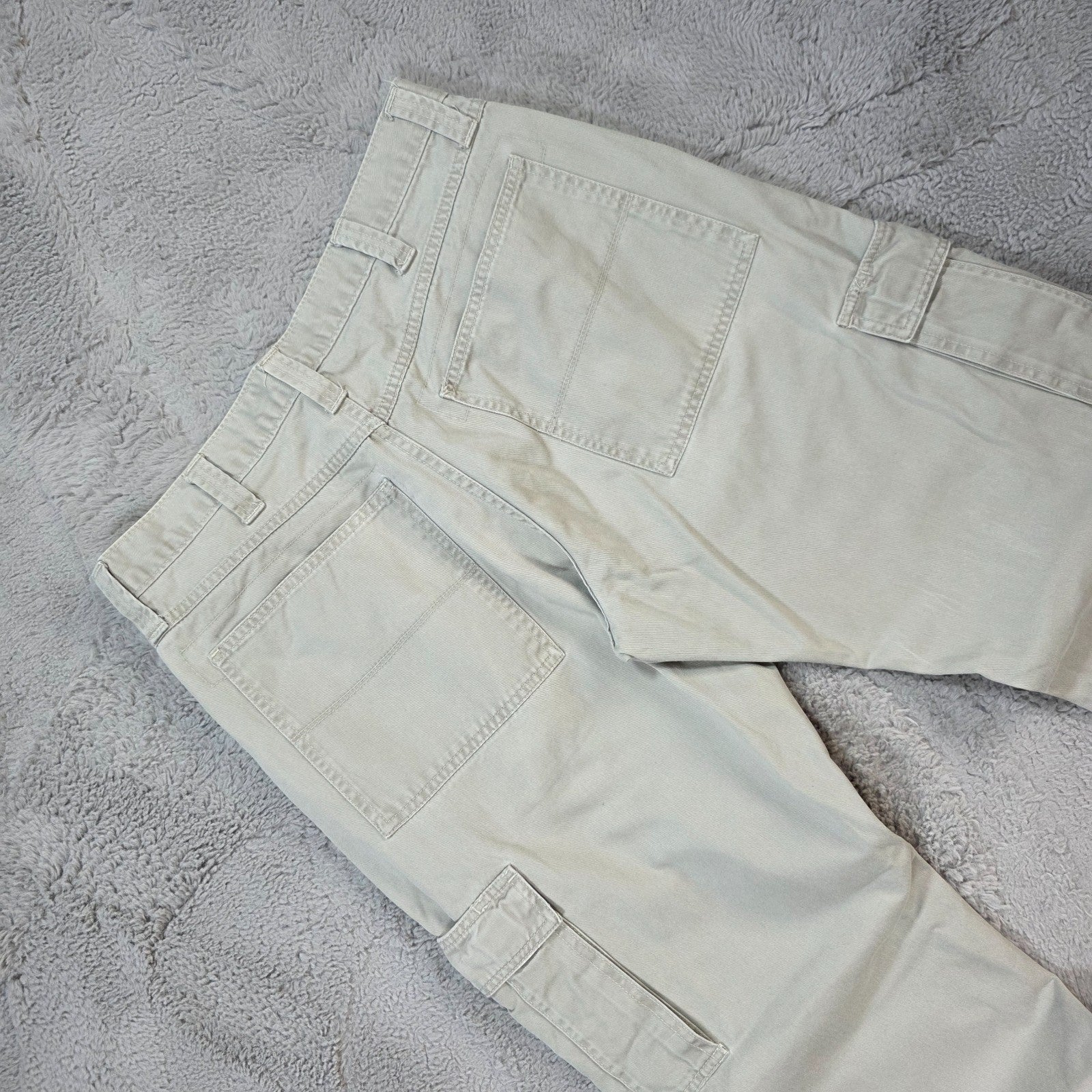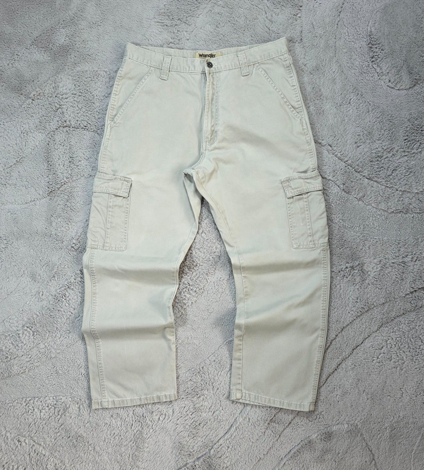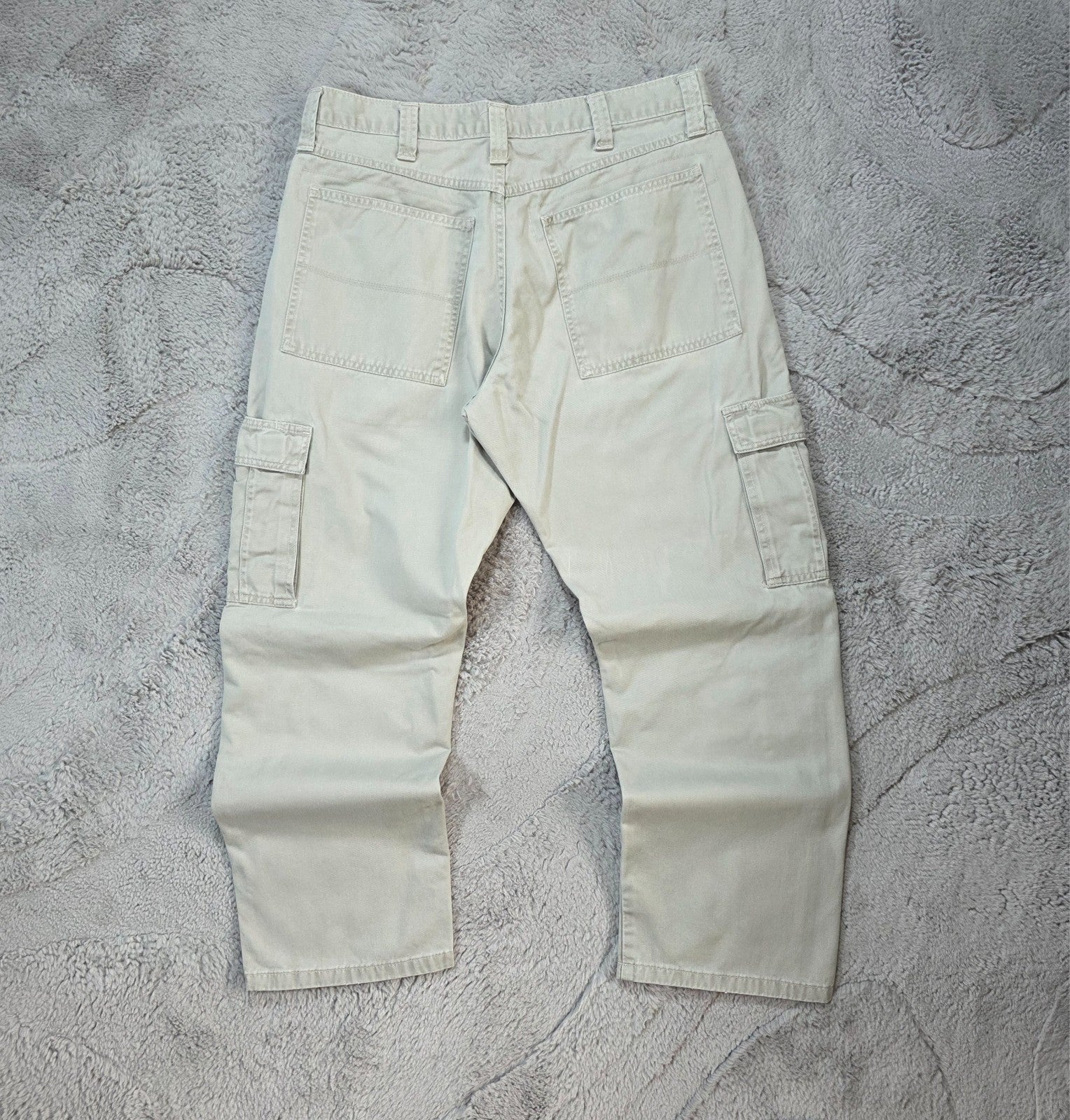 Clean pair of Wrangler Authentics cargo trousers in a washed grey tone. Straight fit, sturdy cotton fabric, and dual cargo pockets. Care label is faded so sizing is based on actual measurements only.
