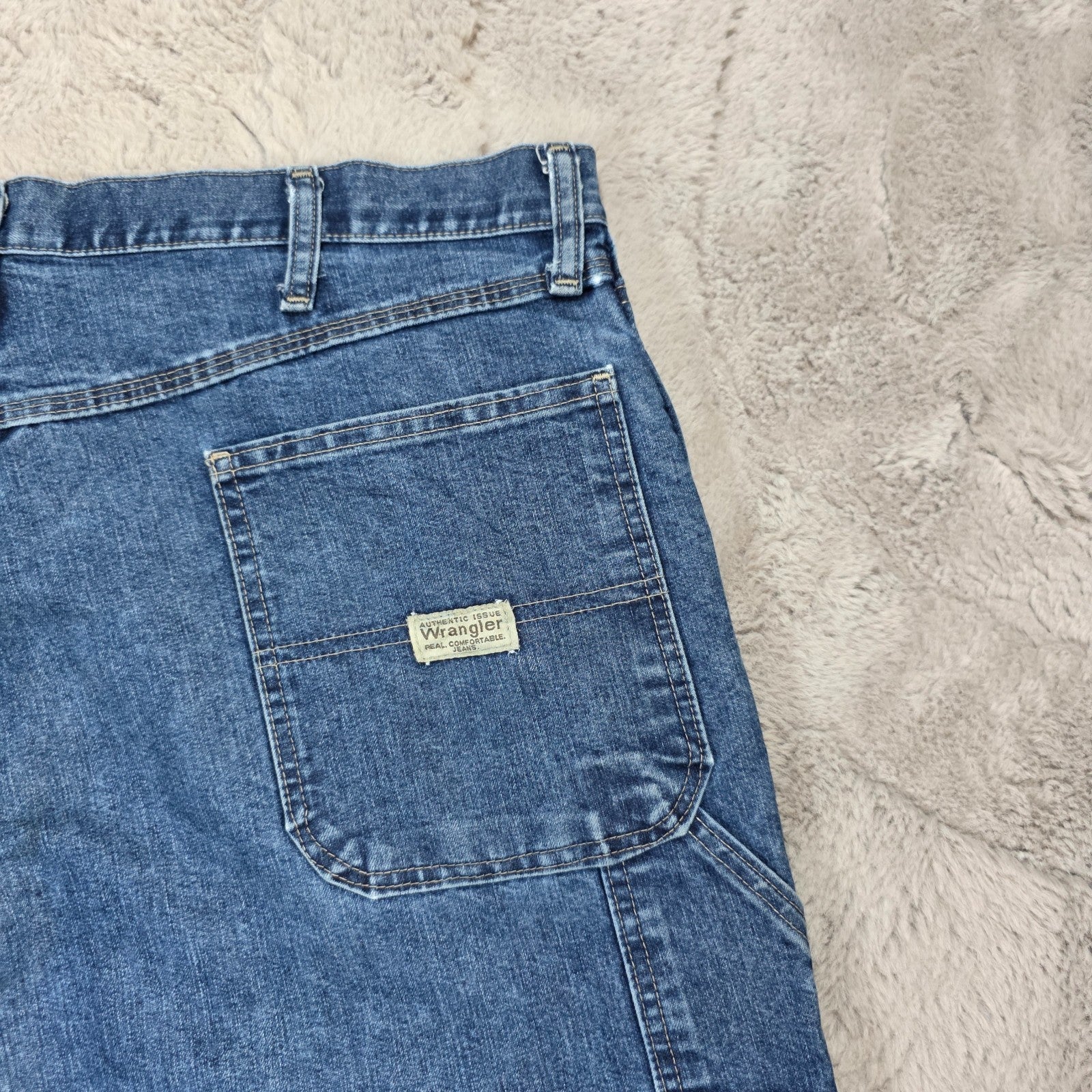 🛠️ Classic Wrangler Carpenter Jeans in blue denim – perfect for workwear or casual style. These jeans feature a straight leg cut, utility pocket and hammer loop, built tough with a cotton/polyester blend for durability.